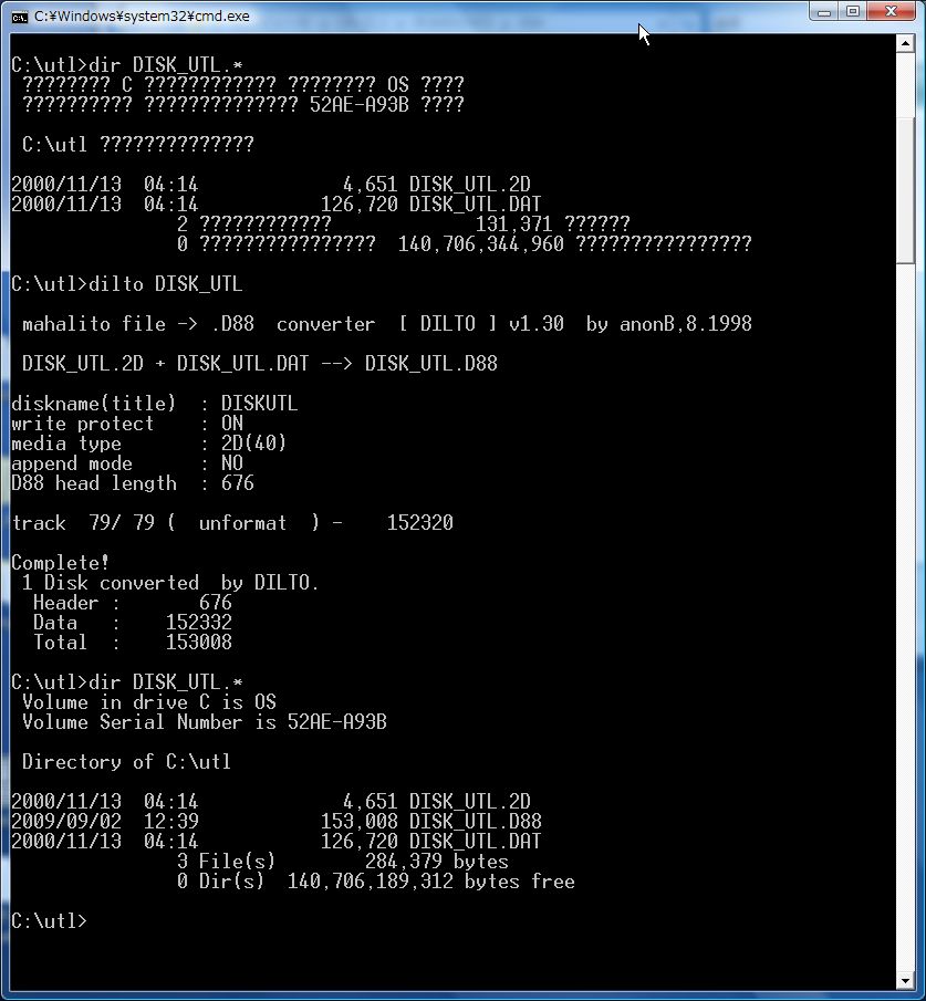 mahalito file -> .D88 converter [ DILTO ] v1.30 by anonB,8.1998 xxx.2D + xxx.DAT --> xxx.D88 diskname(title) : 【適当に入力 ふつうはxxx とソフト名か】 write protect : ON media type : 2D(40) append mode : NO D88 head length : 676 (中略) track 0/ 79 (N=0*16:MFM ) - 0 track 1/ 79 ( unformat ) - 4352 track 2/ 79 (N=1*16:MFM--) - 4352 (中略) Complete! 1 Disk converted by DILTO. Header : 676 Data : 152332 Total : 153008
